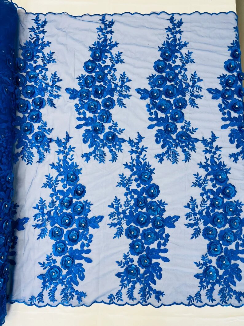 3D Floral Design Embroider and Beaded With Rhinestones on a Mesh Lace-Prom-Fashion-Sold by Yard. Royal