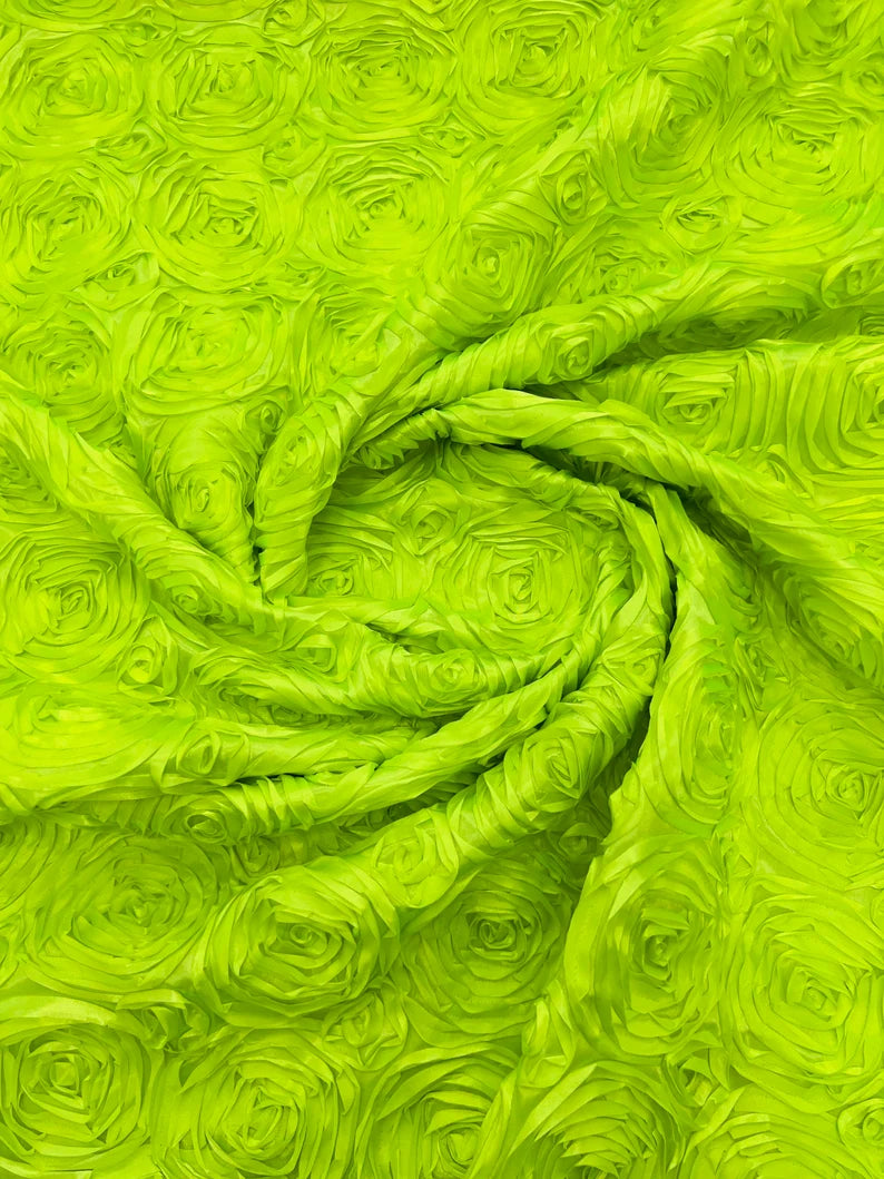 3D Rosette Embroidery Satin Rose Flowers Floral on a satin Fabric by the yard. Neon Yellow