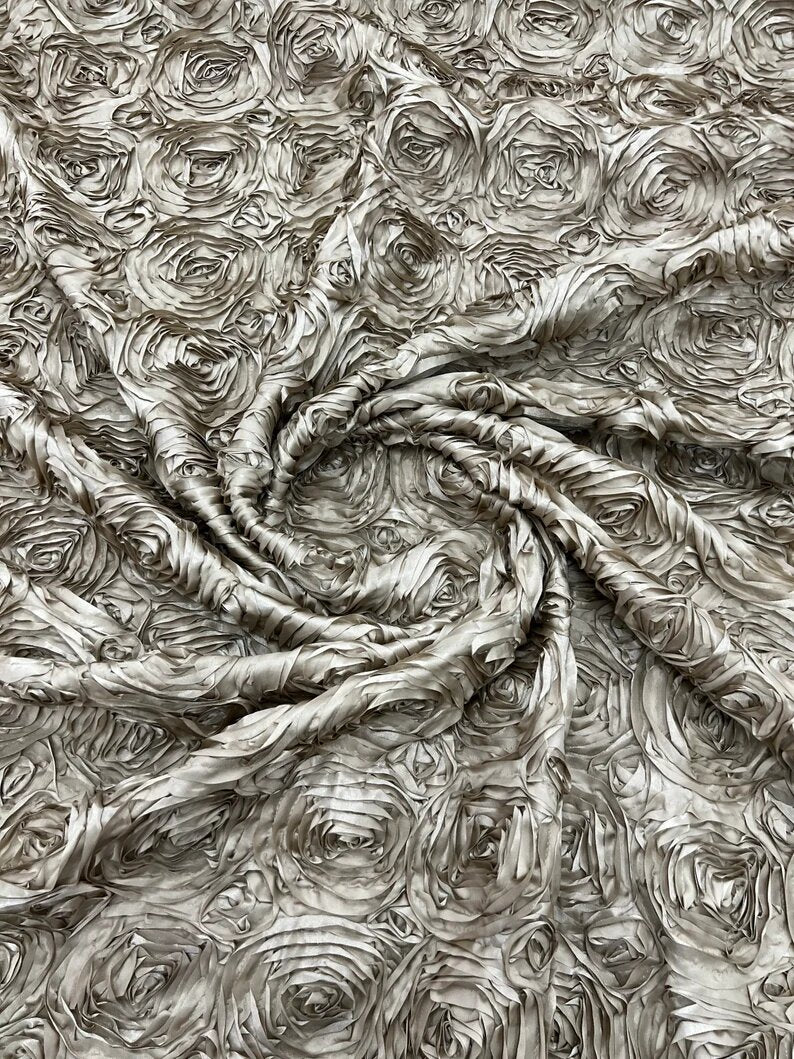 This fabulous fabric features elegant satin ribbon sewn to lightweight satin fabric forming intricate rosettes throughout. Each rosette measures approximately 4.5Â’Â’ wide. Both selvedges feature satin 3'' wide vertical borders. Voluminous and dimensional this fabric is perfect for home décor accents use for tabletop or create duvet covers and pillow covers as well as special occasion apparel dresses and skirts.