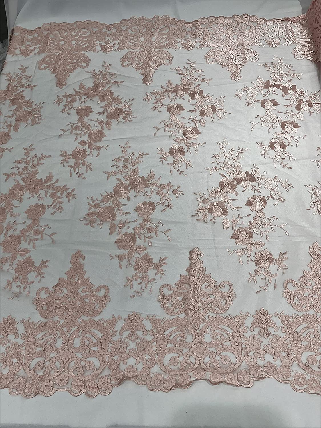 54" Wide Elegant Flower Damask Flat Lace Embroidery On A Mesh (1 Yard, Blush Pink)