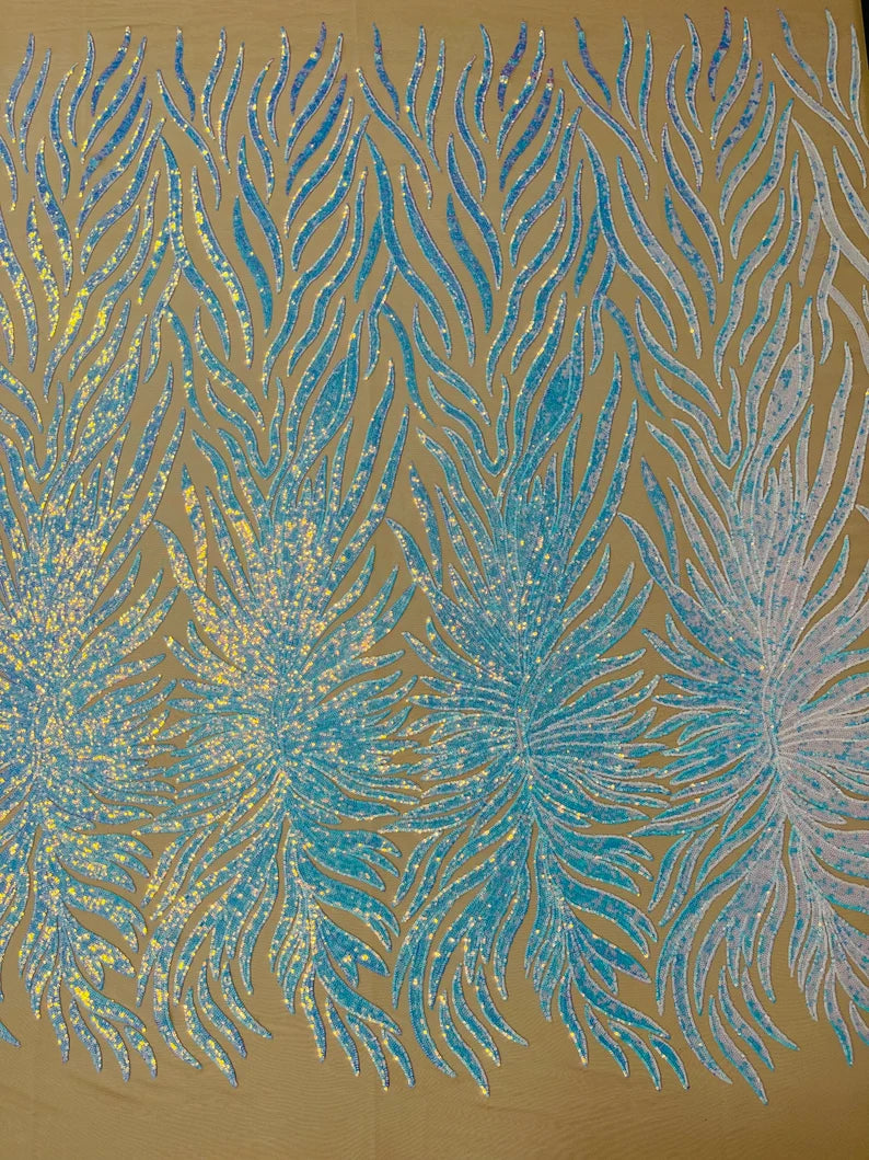 Aqua iridescent phoenix feather design with sequins embroider on a Nude 4 way stretch mesh fabric-sold by the yard.