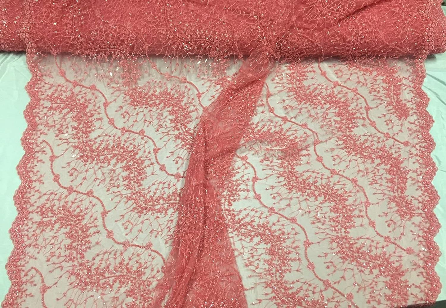 Coral-pink French Beaded Design Embroider On A Mesh-Prom-nightgown-sold By Yard.
