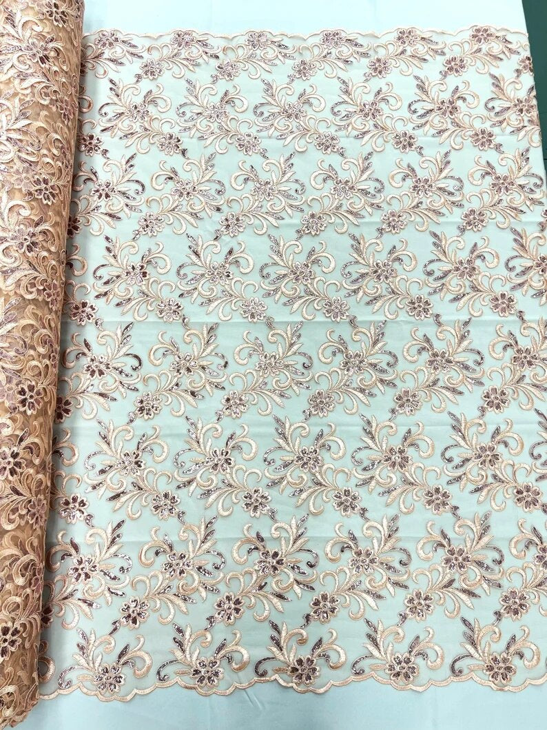 Corded flowers embroider with sequins on a mesh lace fabric-sold by the yard- Blush Pink