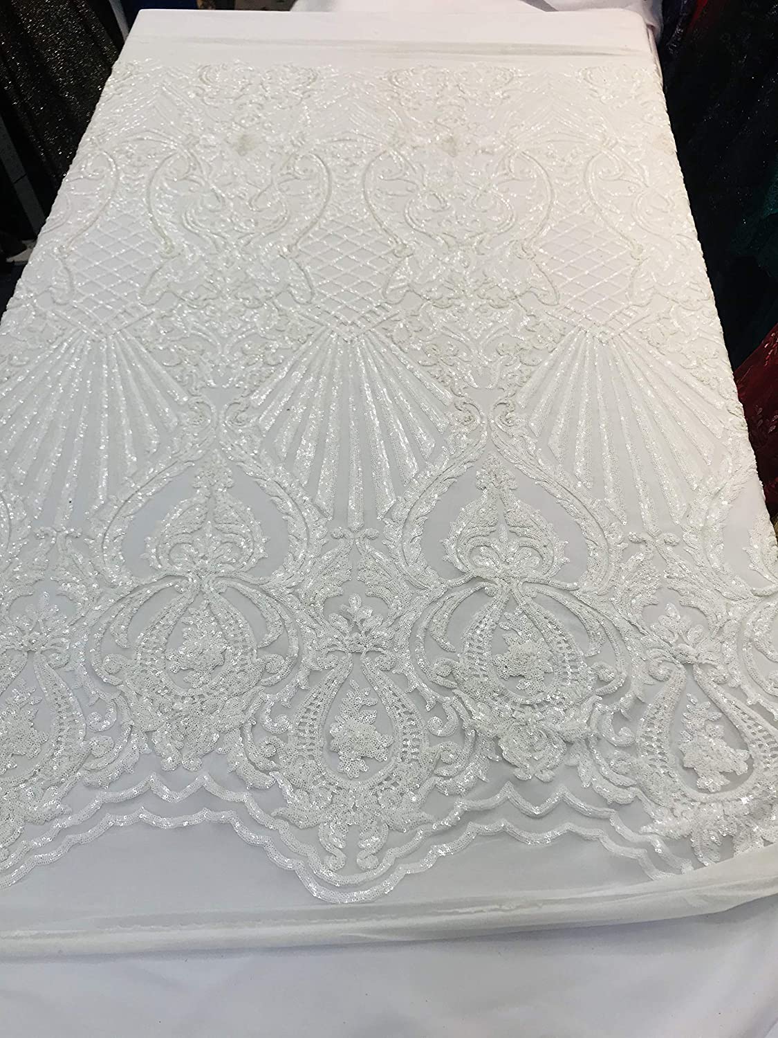 Damask Sequins Design on a 4 Way Stretch Mesh Fabric - for Night Gowns - Prom Dresses - (White on White, 1 Yard)
