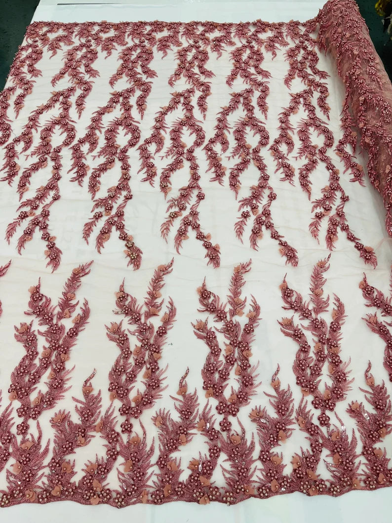 Dusty rose 3D floral Vine Design Embroider and heavy beading on a mesh lace-sold by the yard.