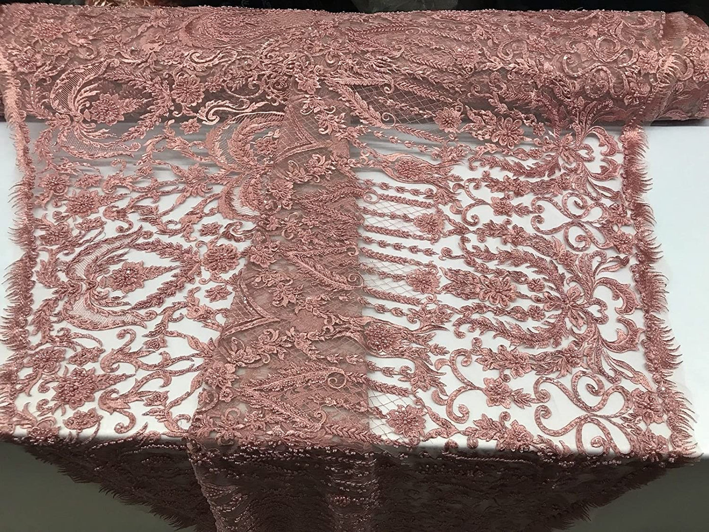 DUSTY ROSE DIVA DESIGN EMBROIDERY WITH HEAVY BEADED ON A MESH-SOLD BY YARD.