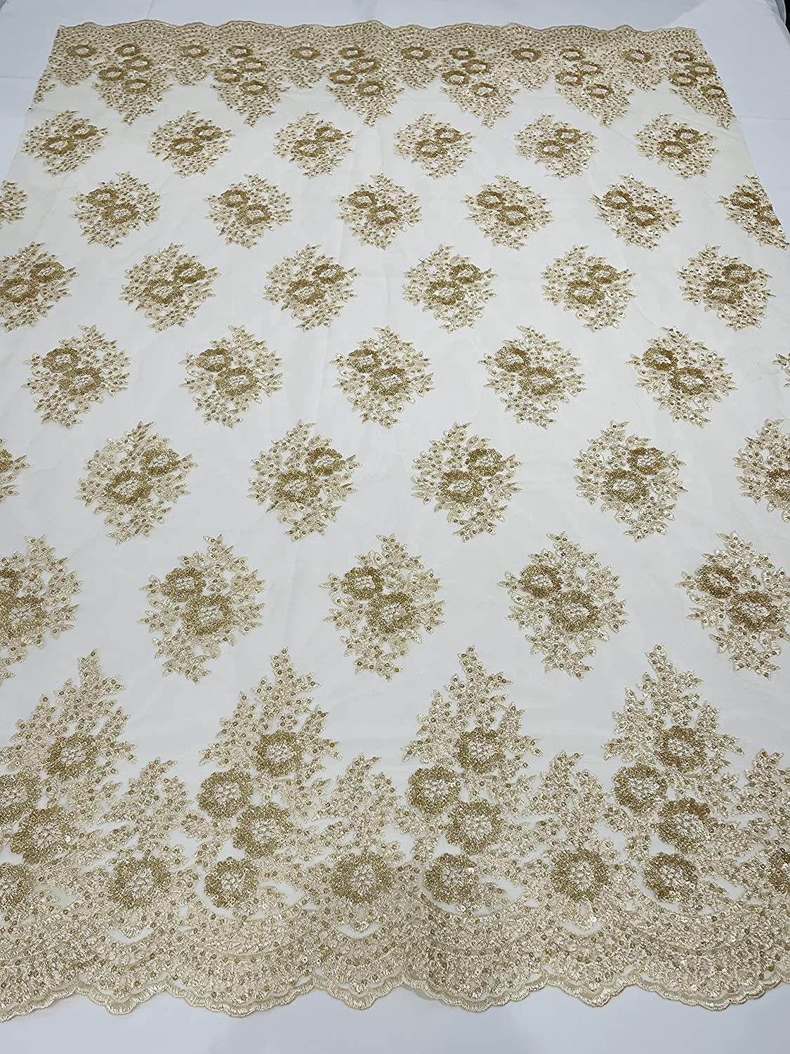 Emma Design Floral Corded Embroider with Sequins, Solid and with Glitter Mesh Lace Fabric (1 Yard, Glitter Mesh Gold on Gold Mesh)