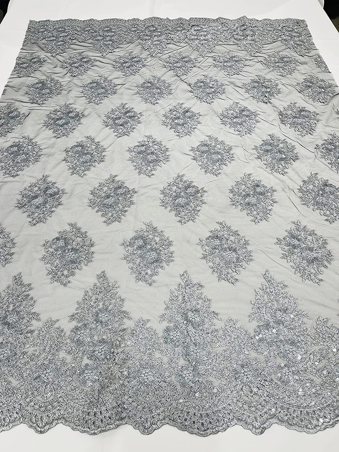 Emma Design Floral Corded Embroider with Sequins, Solid and with Glitter Mesh Lace Fabric (1 Yard, Glitter Mesh Grey on Black Mesh)