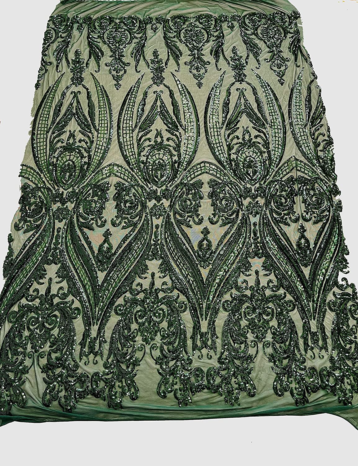 Empire Damask Design with Sequins Embroider On A 4 Way Stretch Mesh Fabric (1 Yard, Hunter Green)