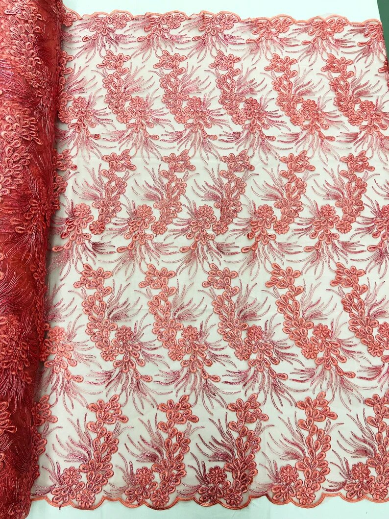 French design embroidered on a mesh lace. This lace has a cord around the feathers so is good for cutting out applications . This lace has sequins embroider on the feathers also has double scallops on the width.The lace can be use for dresses, tablecloths, runners, decoration and much more.