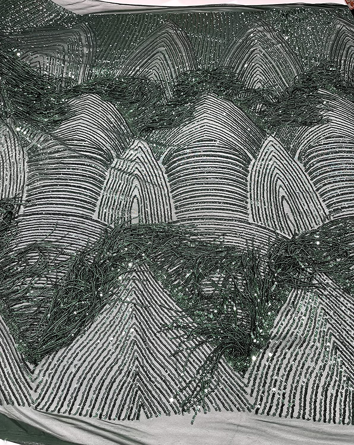Fringe Sequins Design On A Black 4 Way Stretch Mesh Prom Fabric (1 Yard, Hunter Green)