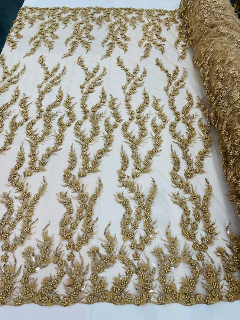 Gold 3D floral Vine Design Embroider and heavy beading on a mesh lace-sold by the yard.