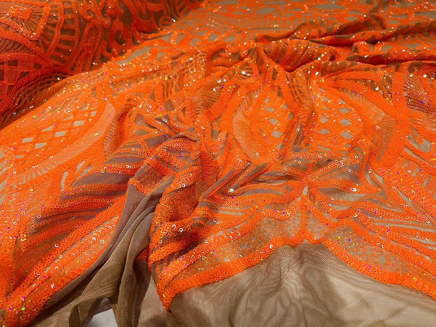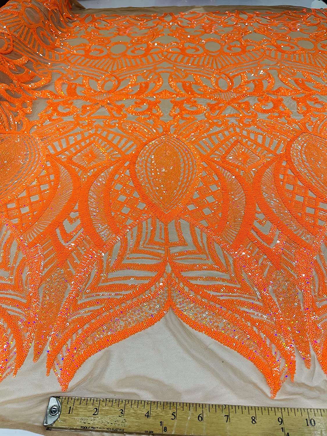 Iridescent Royalty Design On A 4 Way Stretch Mesh/Prom Fabric (1 Yard, Orange on Nude Mesh)