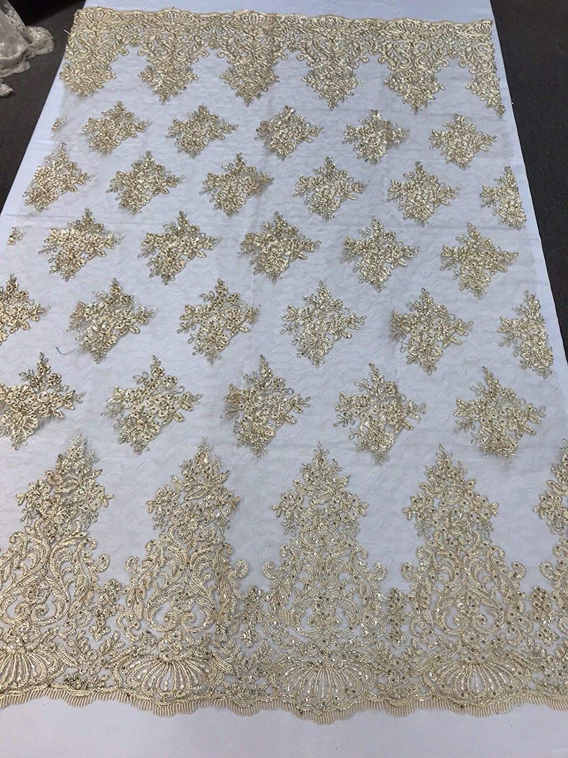 LT-GOLD METALLIC DAMASK LACE EMBROIDERY ON A TEXTURE MESH-BY YARD.