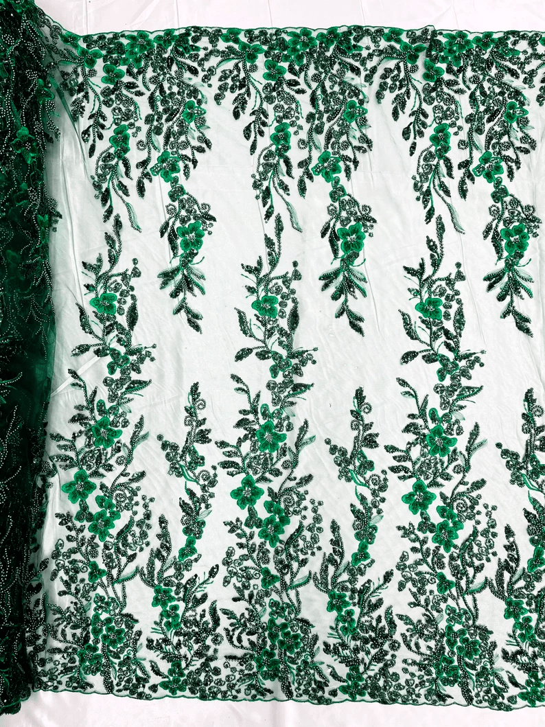Metallic Floral Embroider and Heavy Beaded On a Mesh Lace Fabric-Sold By The Yard- Hunter