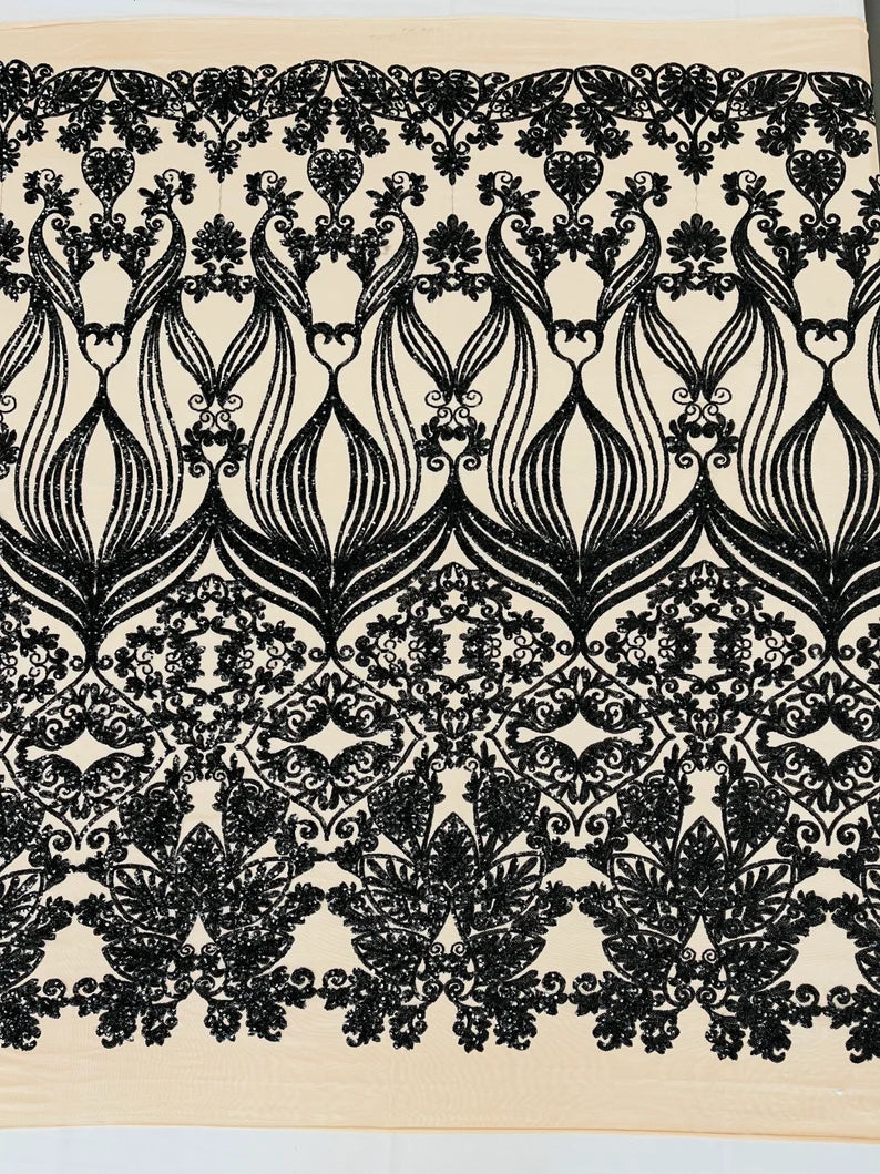 New Black shiny sequin damask design on a Nude 4 way stretch mesh-sold by the yard.