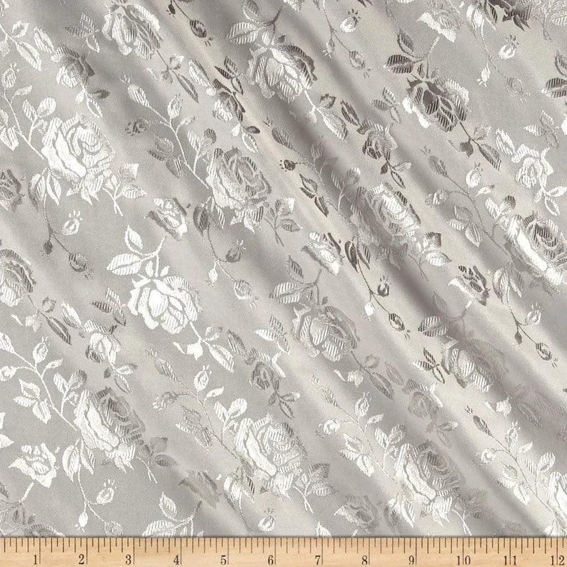 Polyester Flower Brocade Jacquard Satin Fabric, Sold By The Yard. Silver