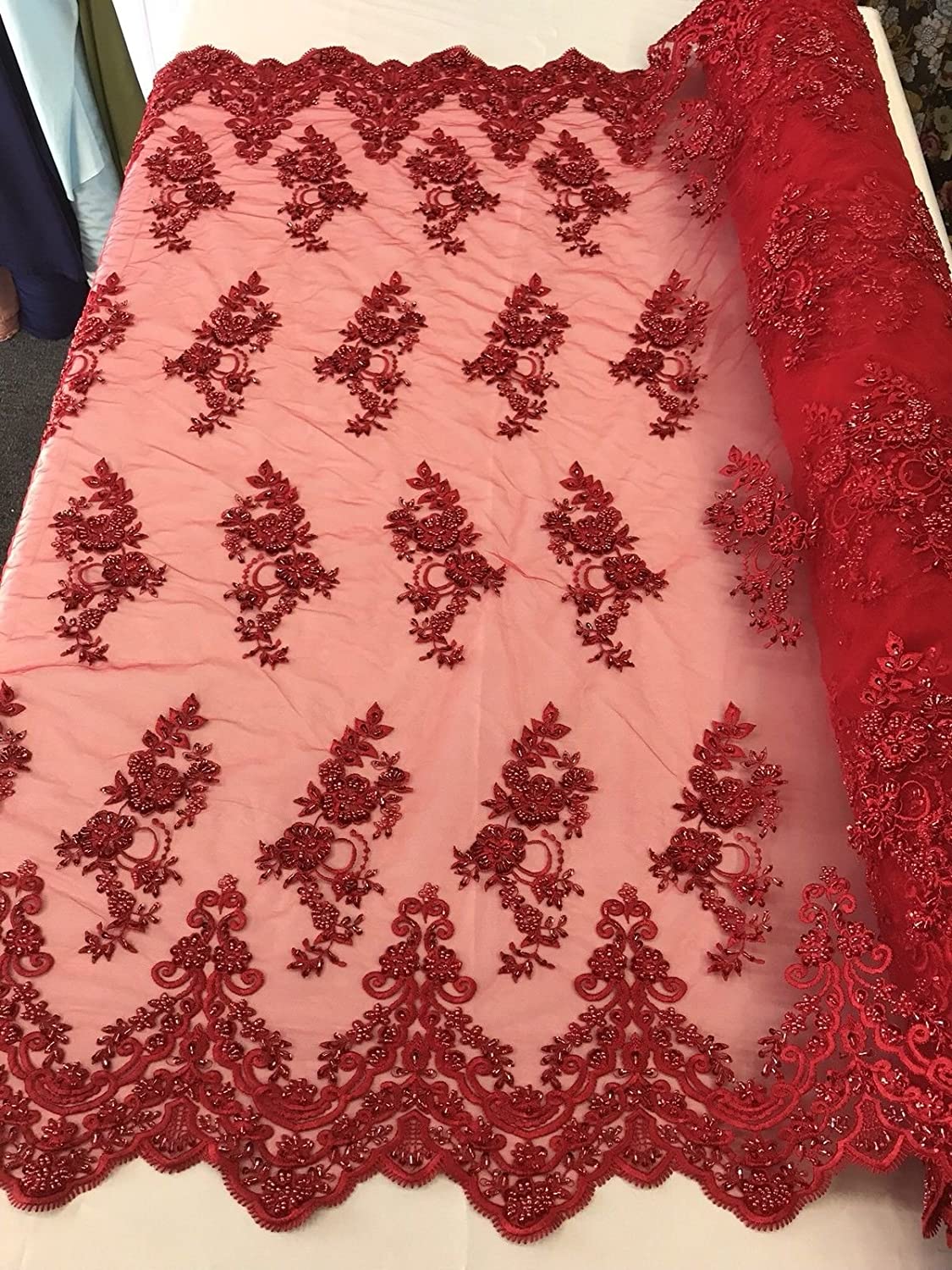 RED HAND BEADED FLORAL DESIGN EMBROIDERY ON A MESH LACE-SOLD BY YARD.