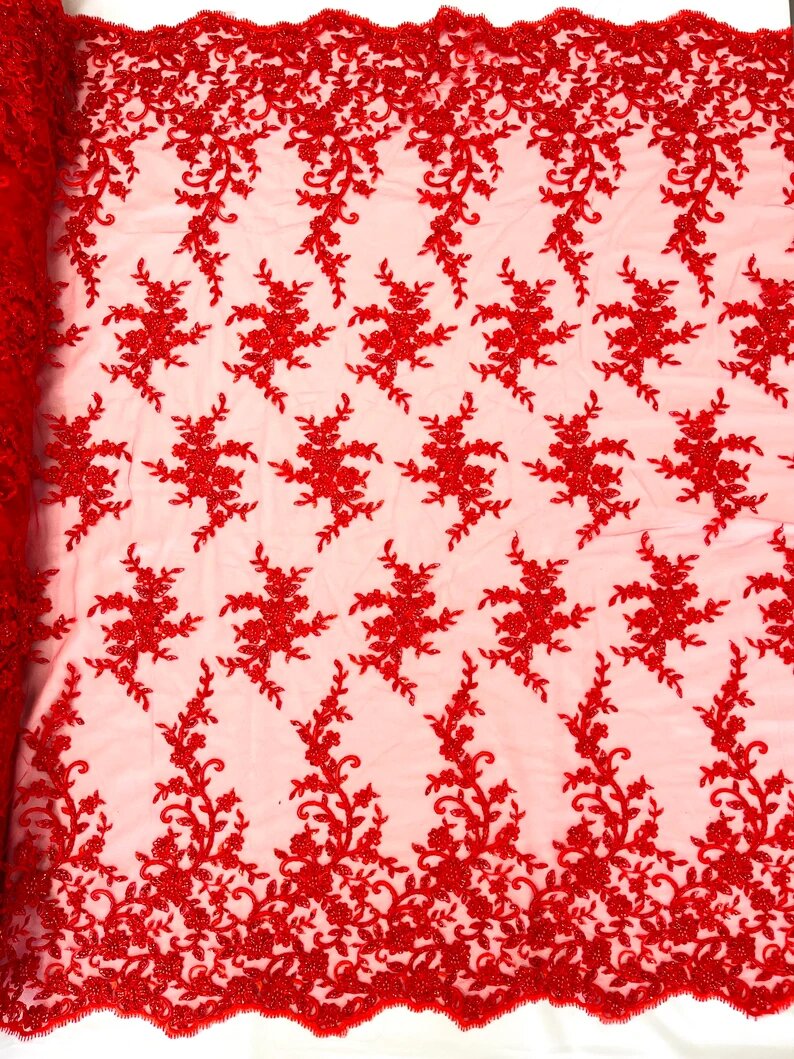 Royalty Fabrics Floral hand beaded design embroider on a mesh lace-prom-sold by the yard. Red