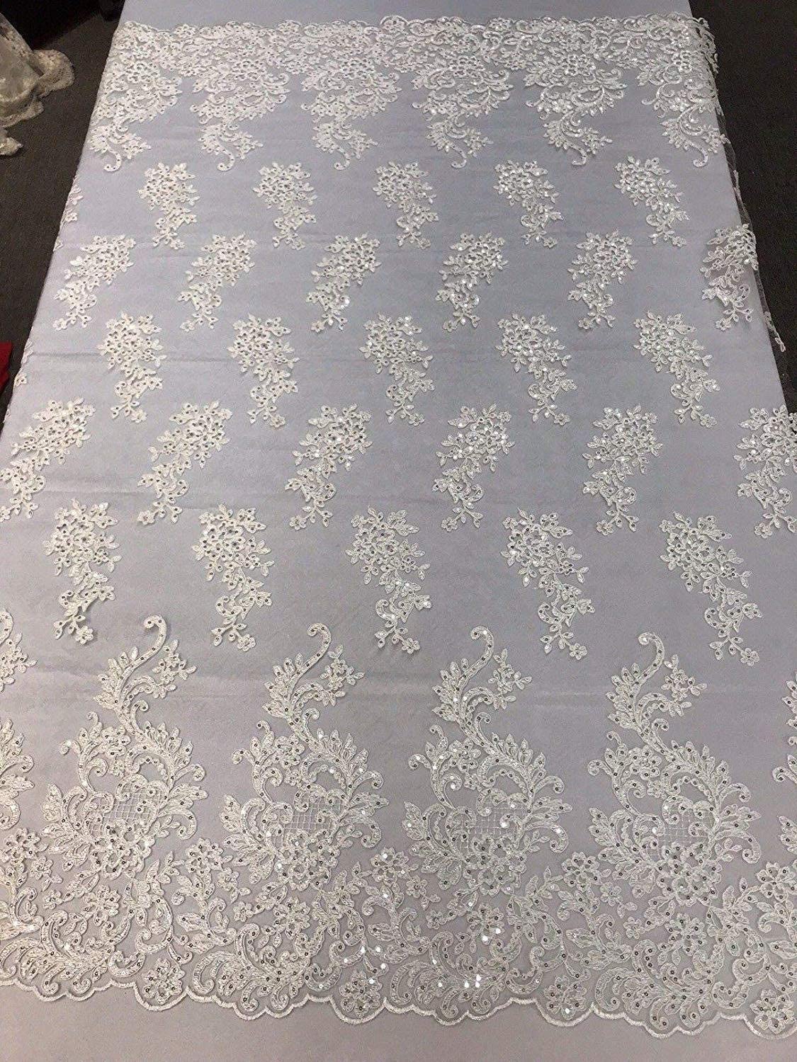 Sequins Lace With Cord Embroidery Flower on Mesh Fabric Texture By The Yard. (Ivory)