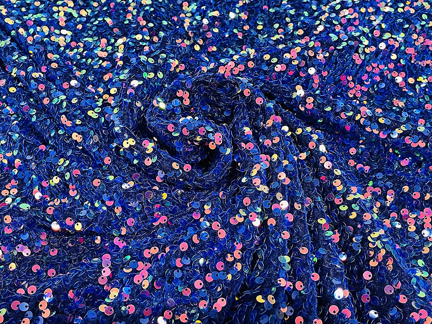Shiny 5mm Sequin On A 2 Way Stretch Velvet (1 Yard, Royal Rainbow in Royal Blue)